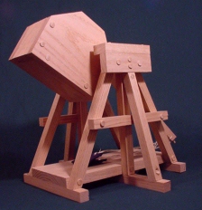 Oak hardwood trebuchet features an open counterweight cabinet for