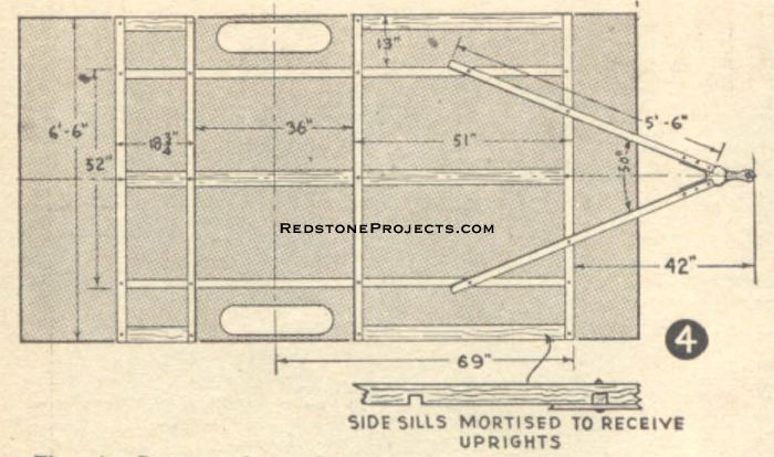Attaching the sides to the trailer platform or floor comes next. Set one wall in position so you can mark the exact position of the notches on the sills and floor. The side sills and floor are notched to receive the 1 5/8" square posts of side wall and then 1/4" x 4 1/4" carriage bolts are inserted through the trailer side and sill with the nut on the inside. Attach both sides similarly, although posts must be cut to fit at wheel housings and doorway.