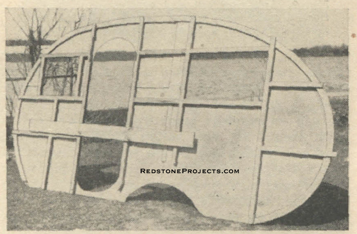 Square up and brace the sides in alignment while attaching the pressed wood to in-sure square, even walls. Round the edges of the pressed wood smoothly and prepare for covering. Fill all screw holes and any irregularities with plastic wood or casein glue to which fine sawdust is added, and sand all surfaces smooth. The trailer shell is covered with heavy weight muslin cemented in place with any good grade of canvas cement. Muslin 80 inches in width is tacked in place along one edge. The surface of the plywood is coated with cement, and the cloth is pressed and smoothed onto the cement with a block. Cover the sides first, then the top, lapping the side material over the top and bringing the top material even with the sides. As the cement has considerable body by itself, the use of heavy canvas is not necessary, and heavy weight muslin is quite satisfactory.