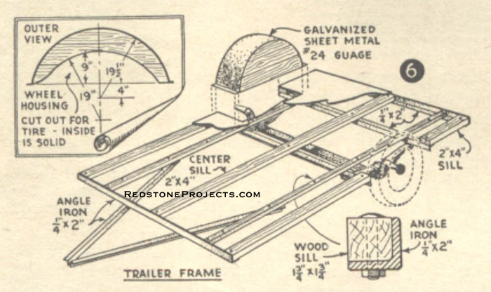 Your frame will be improved greatly by welding all connections where angles bolt together. However, this is not imperative if you do not have access to welding facilities. Floor and Wheel Housings The trailer frame is now ready for the attachment of wood body sills. All sills are cut from 2" x 4"'s, the center and outer sills being of fir, pine, or oak, while the sills along the spring hangers consist of a 2 x 4 ripped in the center, each half fitting inside of the trailer angle iron, as shown in the sketch at Fig. 6.