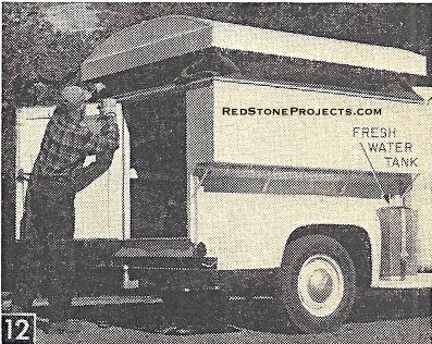 Details of the bracket parts and riser tubes are given in Fig. 7F, and the actual set-up is shown in Fig. 10. First cut the stationary tubes to length. These are not difficult to locate since they about the body studs; the straps which hold them in place can be shaped on the job. Cut the material as in Fig. 7E, secure one end to the stud (Fig. 10) and then bend the remainder to fit. Place the riser tubes in the stationary tubes and put the roof in place temporarily. Be sure the roof is accurately positioned and blocked up to be 3 1/2 in. above the body. Remember to allow for the thickness of the upper bunk on that side. Each of the riser tubes should be centered in the stationary tubes. You can do this with small pieces of wood acting as shims. The riser tube bracket parts can be made around a scrap piece of riser tube. The semi-circular seat for the riser tube can be made by slicing a short length of 1-in. tube in half lengthwise, and welding this to bent up sides. Again, it might be more convenient to have this part made for you, especially since welding is required. Clamp the bracket back in position and then place the riser tube bracket in place against the riser tube. Mark the location of the tube seat on the bracket back and have it welded accordingly. Follow this same procedure with each riser tube and bracket assembly. When this is done you can attach riser tubes to brackets and brackets to headers. Then remove the blocks which were holding the roof up. Lay out 4 3/4 in. from the top of the stationary tube and drill a 3/16 in. hole through both tube and stud. Do this on all four tubes. Use some scrap lumber to raise and support the roof until inside clearance is 6 ft. (or whatever height you require). Check distance from body top to roof in all four corners. All measurements should be equal. Now, using the holes already drilled in the stationary tube as a guide, drill through again to make the matching hole in the riser tube. These holes are for holding the roof in the raised position with the retainer pins (Fig. 10), which are 8 in. lengths of 3/16-in. welding rod bent at a right angle at the center.